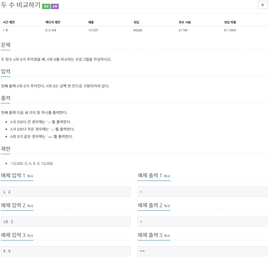 백준 알고리즘 1330번 문제 : 두 수 비교하기 - C언어